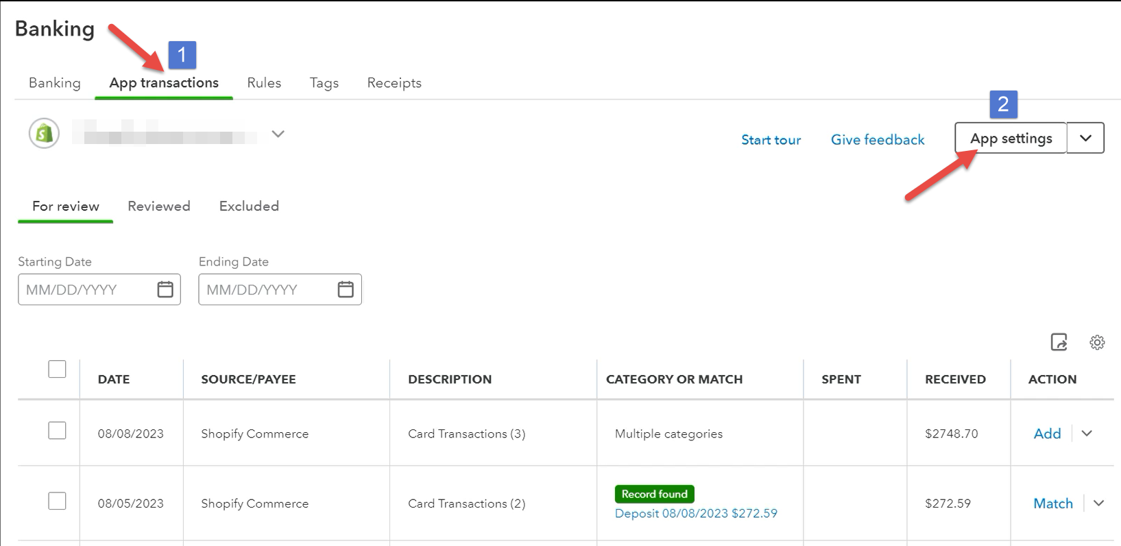 After connecting the Shopify connector app to your QuickBooks, you need to verify the app settings. To do this in QuickBooks, go to Transactions > App transactions > select App settings.