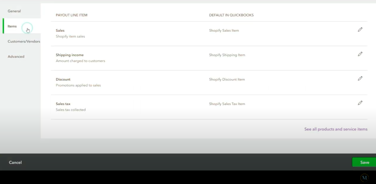 Next on the left menu is Items. The Payout Line Items include Sales, Shipping income, Discount, and Sales tax. You’ll need to review the mapping to the corresponding product and service items in QuickBooks.