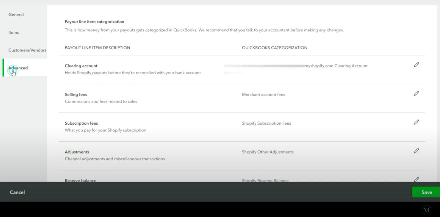 Last, under the Advanced tab is the ability to verify how payout line items will be mapped in QuickBooks. This will include the clearing account, selling fees, subscription fees, adjustments, and reserve balance. You’ll make changes as needed and select Save when you're done.