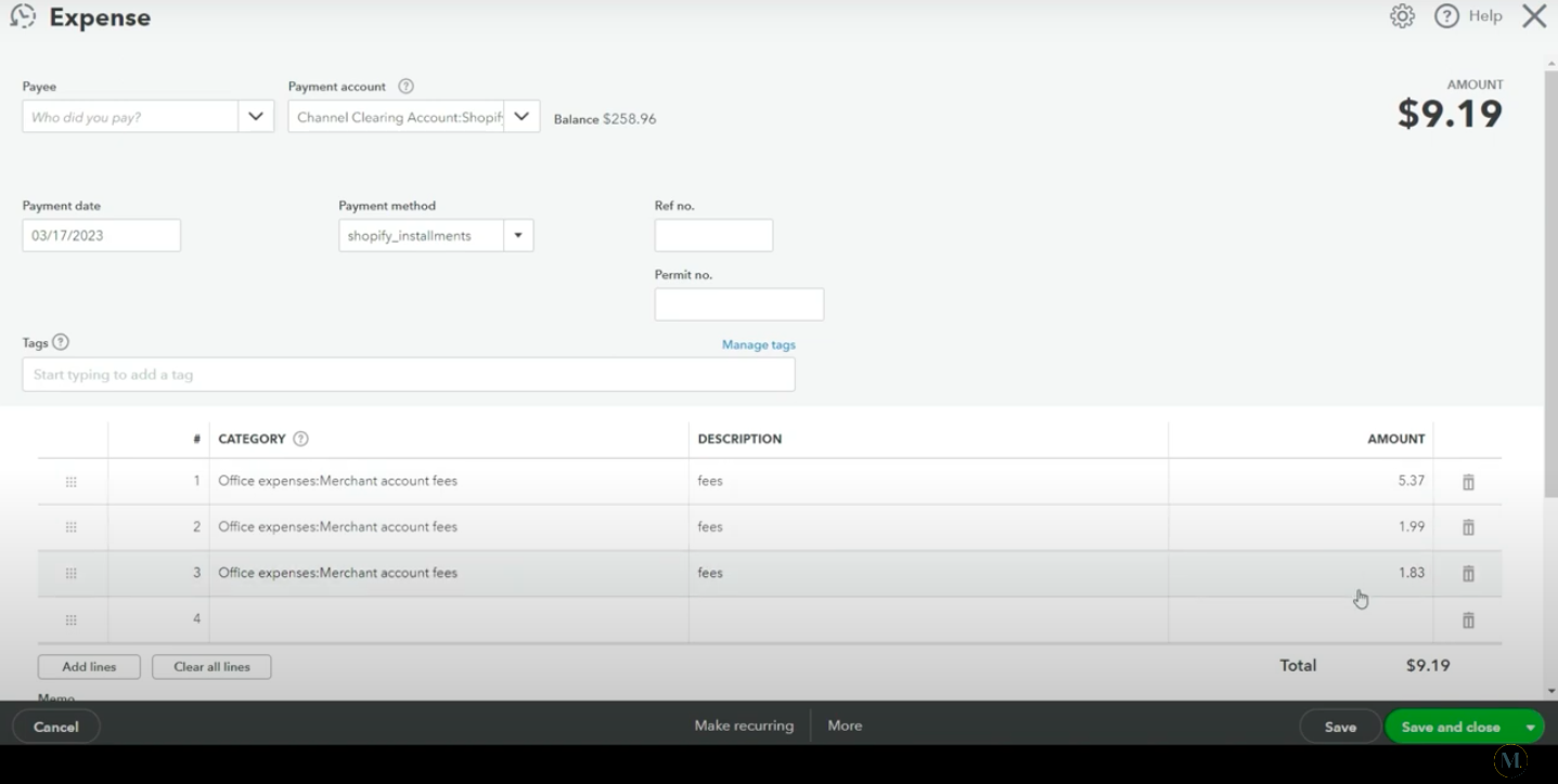 The expense transaction recorded in QuickBooks will reflect the Shopify Payments processing fees. They will be recorded to merchant account fees or the account that you selected in your app integration settings. See the example below.
