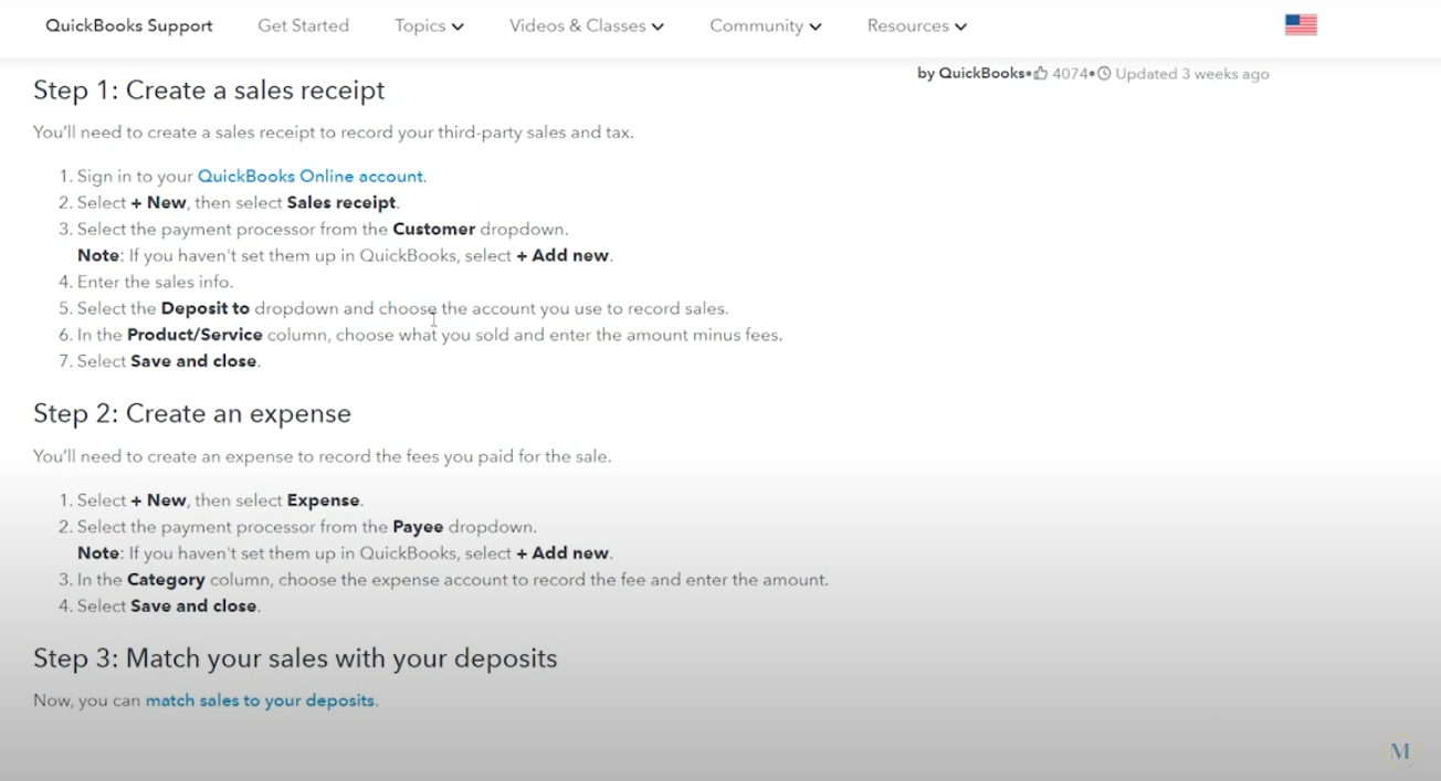 So how should you handle third party payment processors? Well, the QuickBooks Support knowledge base suggests recording a sales receipt for your third-party payouts and recording an expense transaction for the corresponding fees, as detailed below.