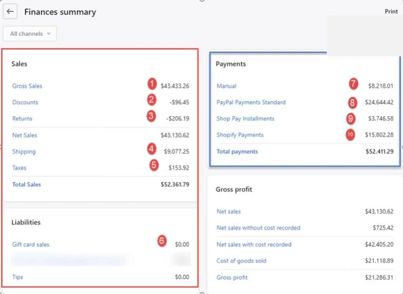 Let’s go over the different sections you’ll find on the finances summary report in Shopify. From the screenshot below, you’ll see Sales and Liabilities on the left side, and Payments (which are payouts) on the right side.