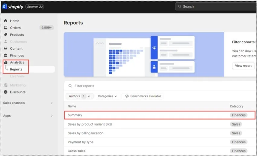 First we’ll need to run a Finances Summary report in Shopify. To find the right report, you’ll go to Analytics, then Reports, and then select Summary.