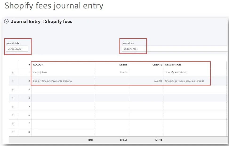 As shown in the example above, for the first row of your journal entry, use the account category of Shopify fees. Debit the fee for the amount from the Payouts Report. Enter another line for Shopify Payments Clearing, and put that in the Credits column. The description for the first line will be “Shopify Fees (debit)”. Then the next line is “Shopify Payments Clearing (credit)”.