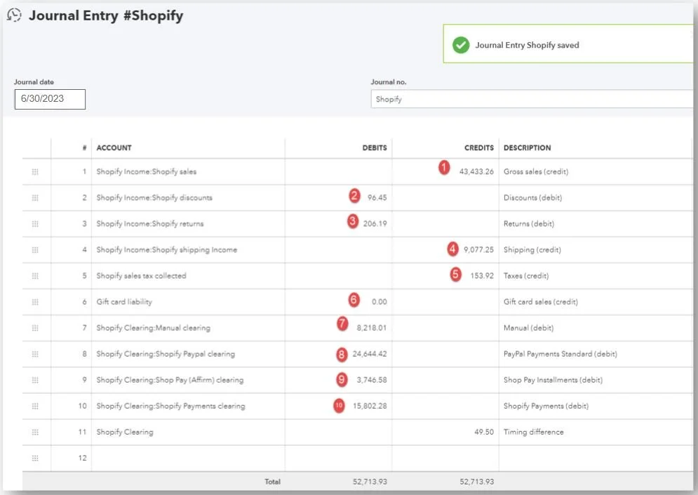 Take a look at the screenshots above and let’s make sense of this journal entry. Remember that we coded each of the transactions that we will be using from the Finances summary in big red numbers. You’ll find the corresponding line on the journal entry example above coded with the same number. We already set up all the accounts used in this journal entry using Shopify Bookkeeping Blueprint, so use that for your reference as needed.