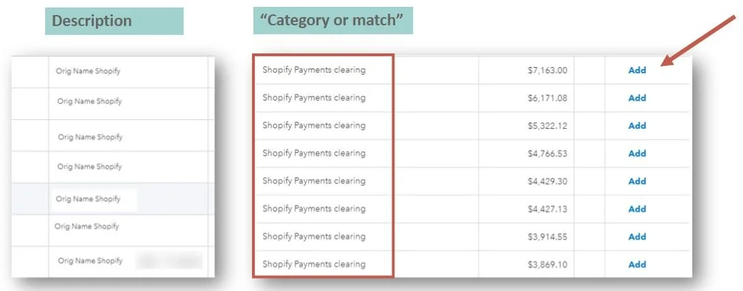 For the category or match, change the account category to Shopify Payments Clearing. Then, go to the right and click Add to add those transactions to QuickBooks and categorize them properly without duplicating income.
