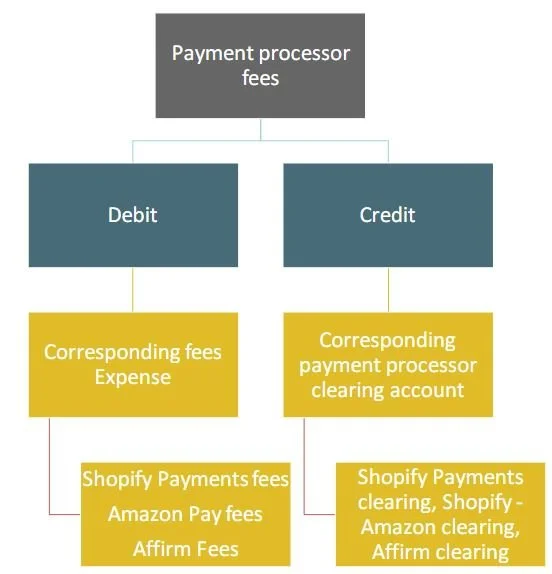 As you can see in the chart above, we're going to debit or put amounts in the debits column for the expense. We're going to use an account that corresponds to the payment process or expense that we're using. That might be Shopify Payment fees, Amazon Pay fees, Affirm fees, or whatever kind of fees you have.