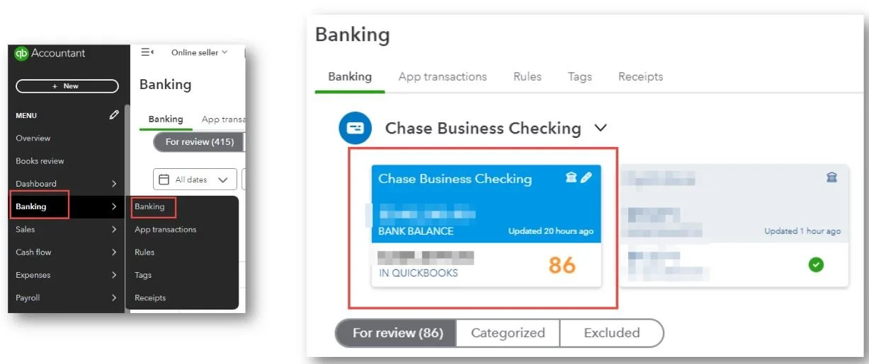 Finally, it’s time for our last step, to categorize deposits from payment processors. We’re going to start by going to the QuickBooks Banking transactions. In QuickBooks from the left side menu, go to Banking and select Banking, and then find the bank account that receives all of the deposits from your payment processors.