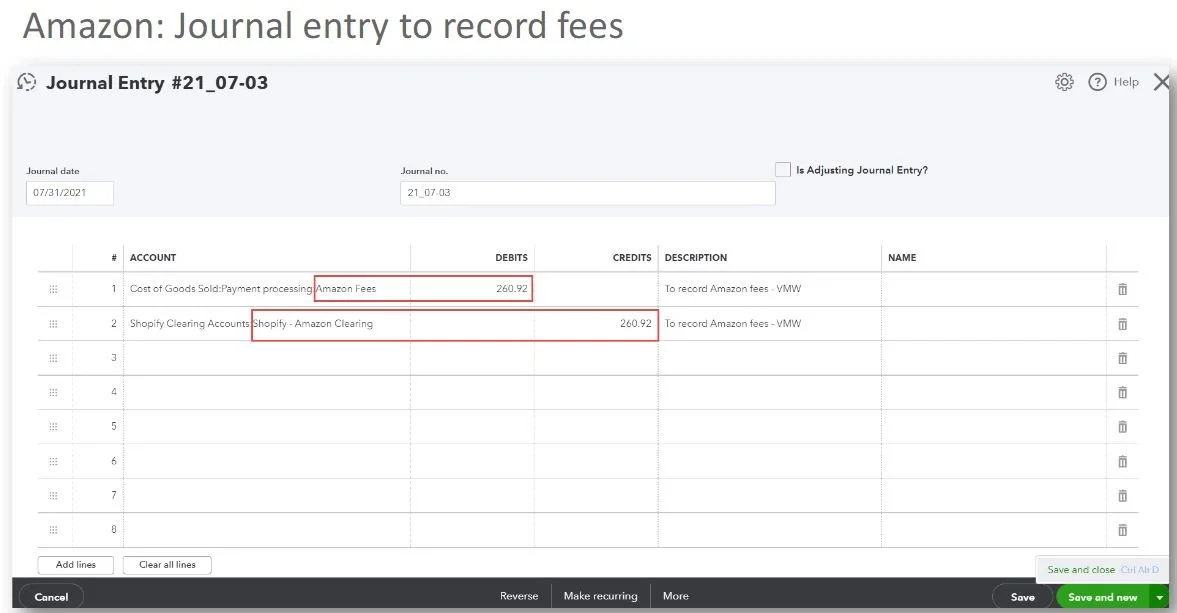 Next you’ll make the journal entry in QuickBooks Online. Click the + New button, then select Journal Entry. You will debit the Amazon fees account for the amount that was on the report. You will then create a second line and credit Shopify - Amazon Clearing for the same amount. See our example of this journal entry below.
