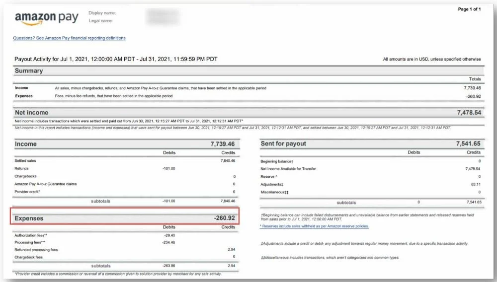 As an example of how to record other payment processor fees, we’ll take a look at how to record for Amazon Pay fees. From Amazon, you’ll need to find the Report of fees and then find the amount of expenses on that report. See an example below of where to find the expenses on that report.
